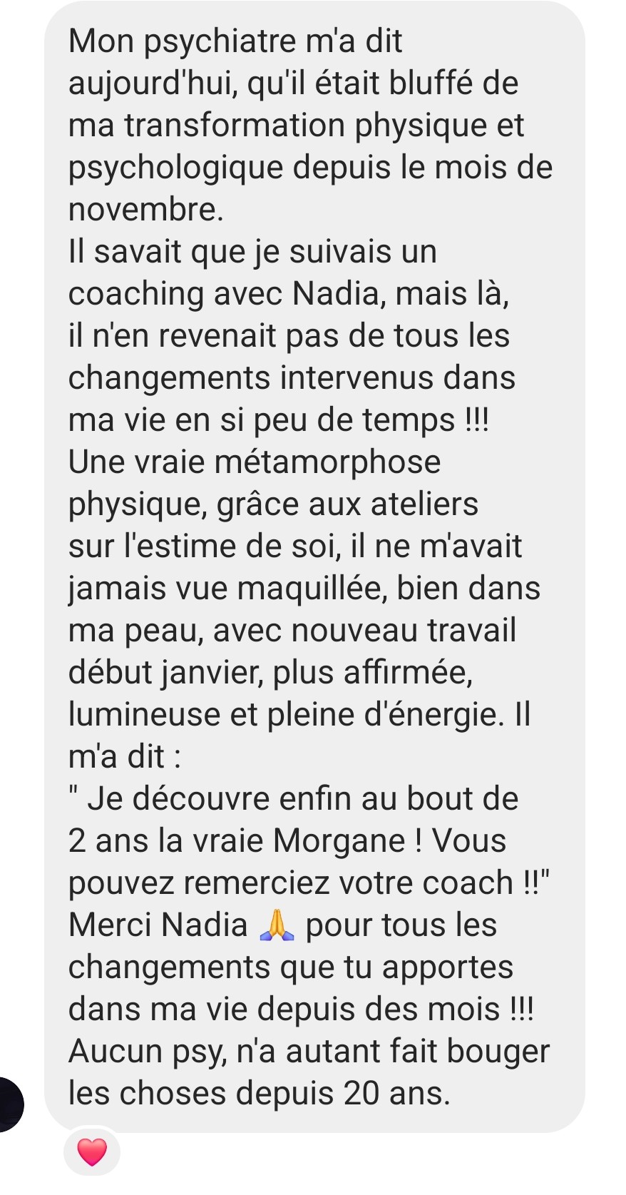 Je ne pensais pas que ce coatching avec toi me ferait tant de bien. Je rends grâce à Dieu de t'avoir placée sur ma route afin qu'il puisse guérir des blessures en moi. Ce changement ne se voit peut-être pas trop encore (ça ne fait que 3 semaines) mais je reprends confiance en moi. Et mon image de moi-même devant un miroir a changé [...] Des années avec des psy et pas de grands changements et toi tu arrives et des choses se déverrouillent. Merci coatch❤️"