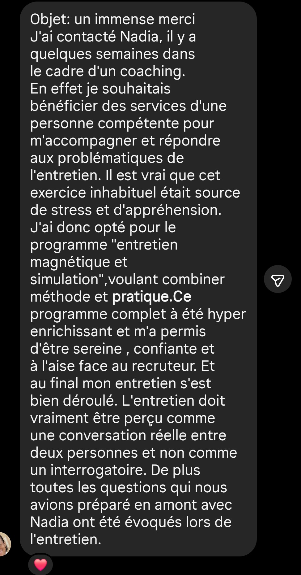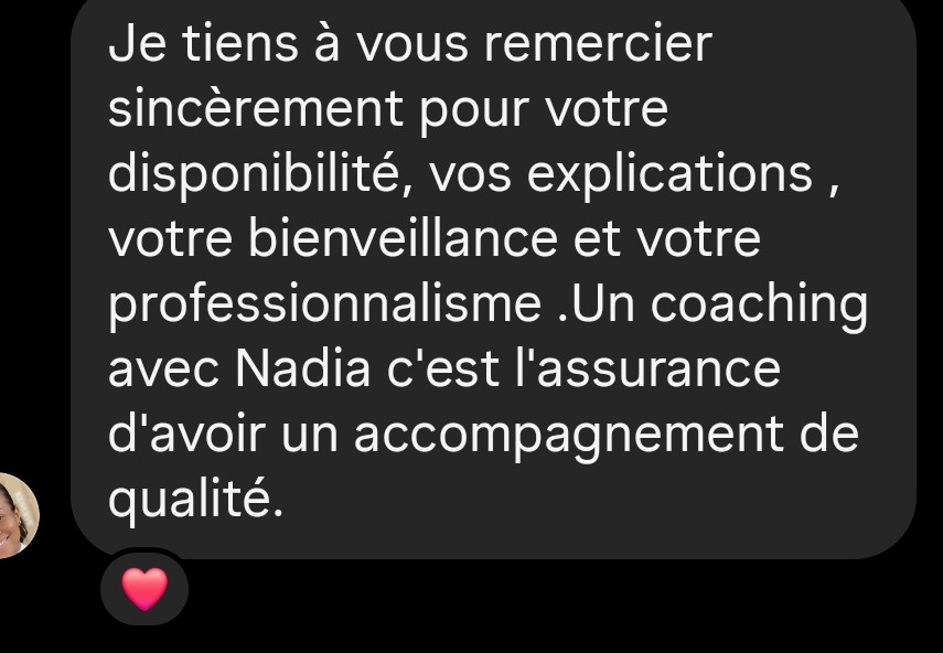 "J'ai fait appel à Nadia pour un coaching professionnel.
