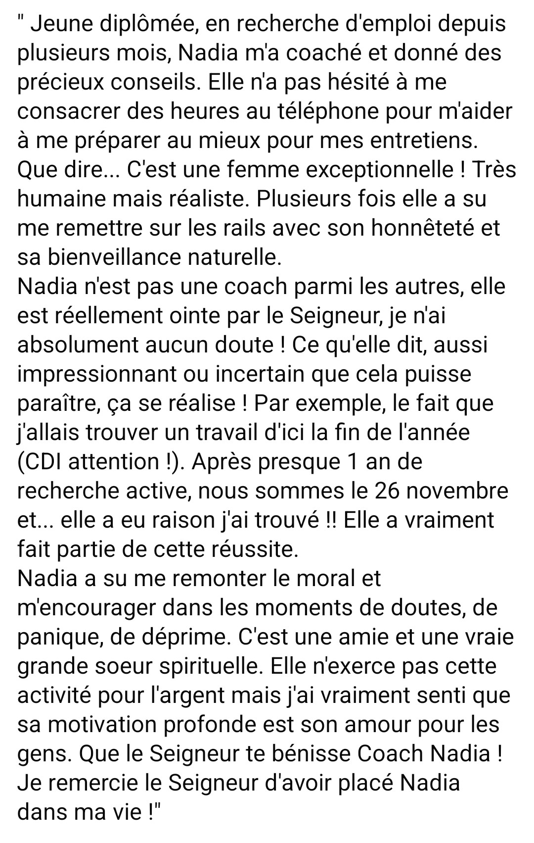 Nadia n'est pas une coach parmi les autres, elle est réellement ointe par le Seigneur, je n'ai absolument aucun doute ! Ce qu'elle dit, aussi impressionnant ou incertain que cela puisse paraître, ça se réalise ! Par exemple, le fait que j'allais trouver un travail d'ici la fin de l'année (CDI attention !). Après presque 1 an de recherche active, nous sommes le 26 novembre et... elle a eu raison j'ai trouvé !! Elle a vraiment fait partie de cette réussite. "