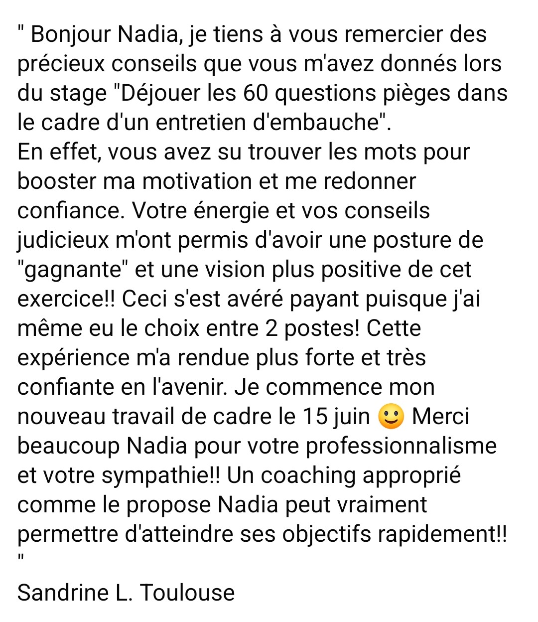 Bonjour Nadia, je tiens à vous remercier des précieux conseils que vous m'avez donnés lors du stage "Déjouer les 60 questions pièges dans le cadre d'un entretien d'embauche". En effet, vous avez su trouver les mots pour booster ma motivation et me redonner confiance. Votre énergie et vos conseils judicieux m'ont permis d'avoir une posture de "gagnante" et une vision plus positive de cet exercice!! Ceci s'est avéré payant puisque j'ai même eu le choix entre 2 postes! Cette expérience m'a rendue plus forte et très confiante en l'avenir. Je commence mon nouveau travail de cadre le 15 juin :-) Merci beaucoup Nadia pour votre professionnalisme et votre sympathie!! Un coaching approprié comme le propose Nadia peut vraiment permettre d'atteindre ses objectifs rapidement!!