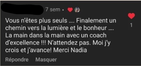 Pour avoir suivi plusieurs thérapies depuis plus de 20 ans, je n'aurais jamais espéré obtenir ces résultats sans ce coaching. Nadia, nous à permis d'avoir les clés pour ne plus subir nos vies, mais redevenir maître de nos destins.