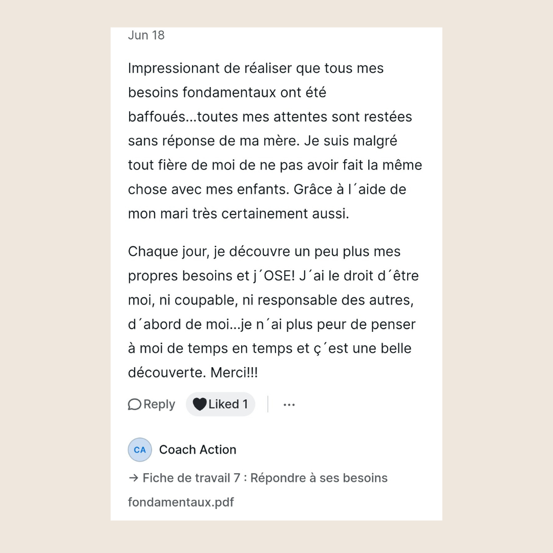 “Tu es bénie coatch car petit à petit je commence à aimer à prendre soin de moi, de mon cœur, de mon âme, de mes pensées.